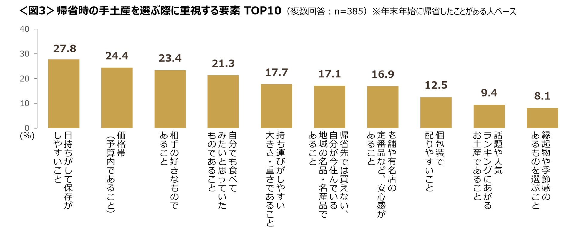 帰省時の手土産を選ぶ際に重視するのは、「日持ちがして保存がしやすいこと」(27.8%)が「価格帯」(24.4%)を上回りトップ。