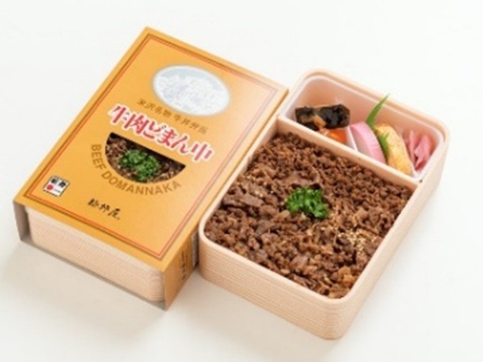 山形県産米「どまんなか」をふっくら炊き上げ、その上に特製のタレで味付けした牛そぼろと牛肉煮をのせた牛丼風のお弁当です。