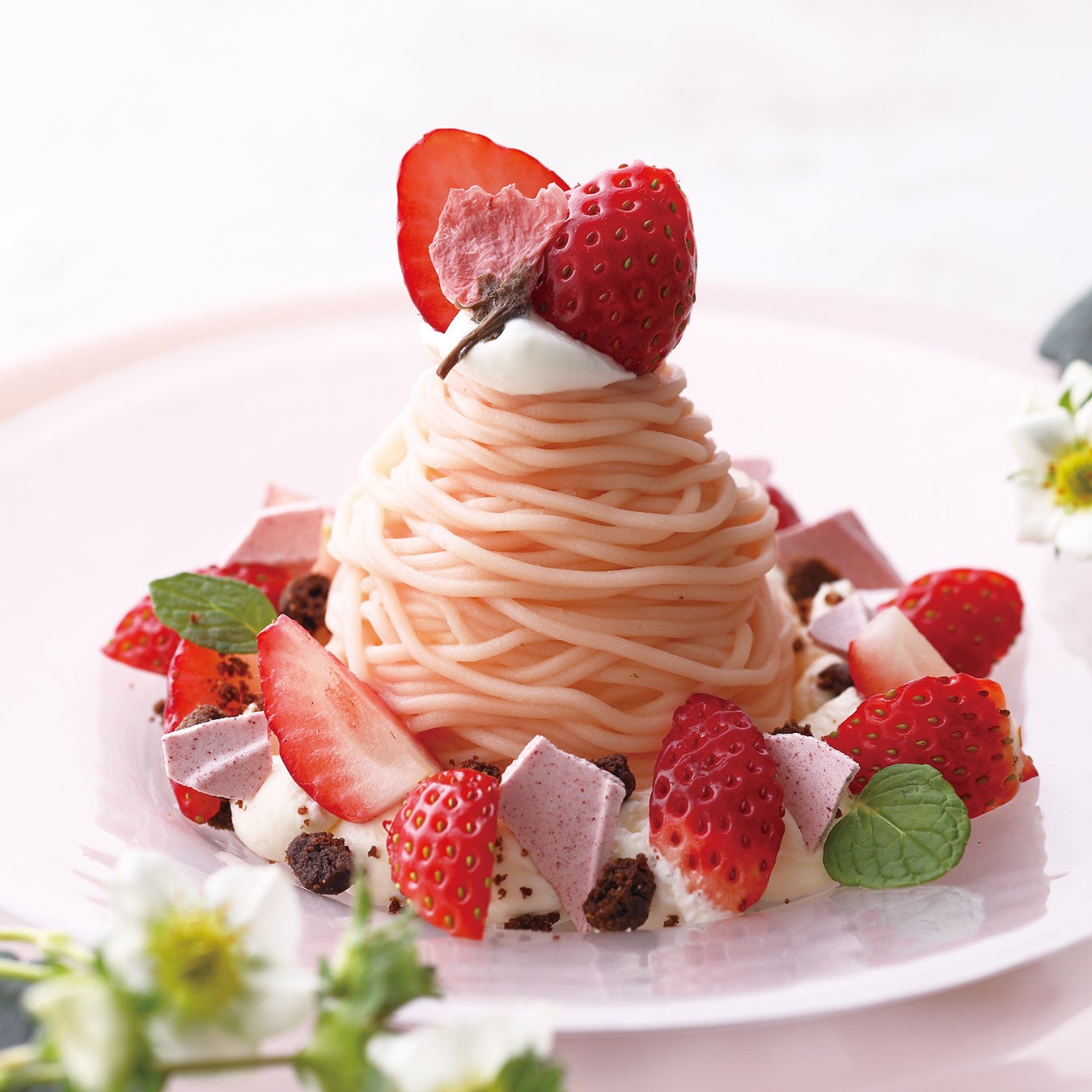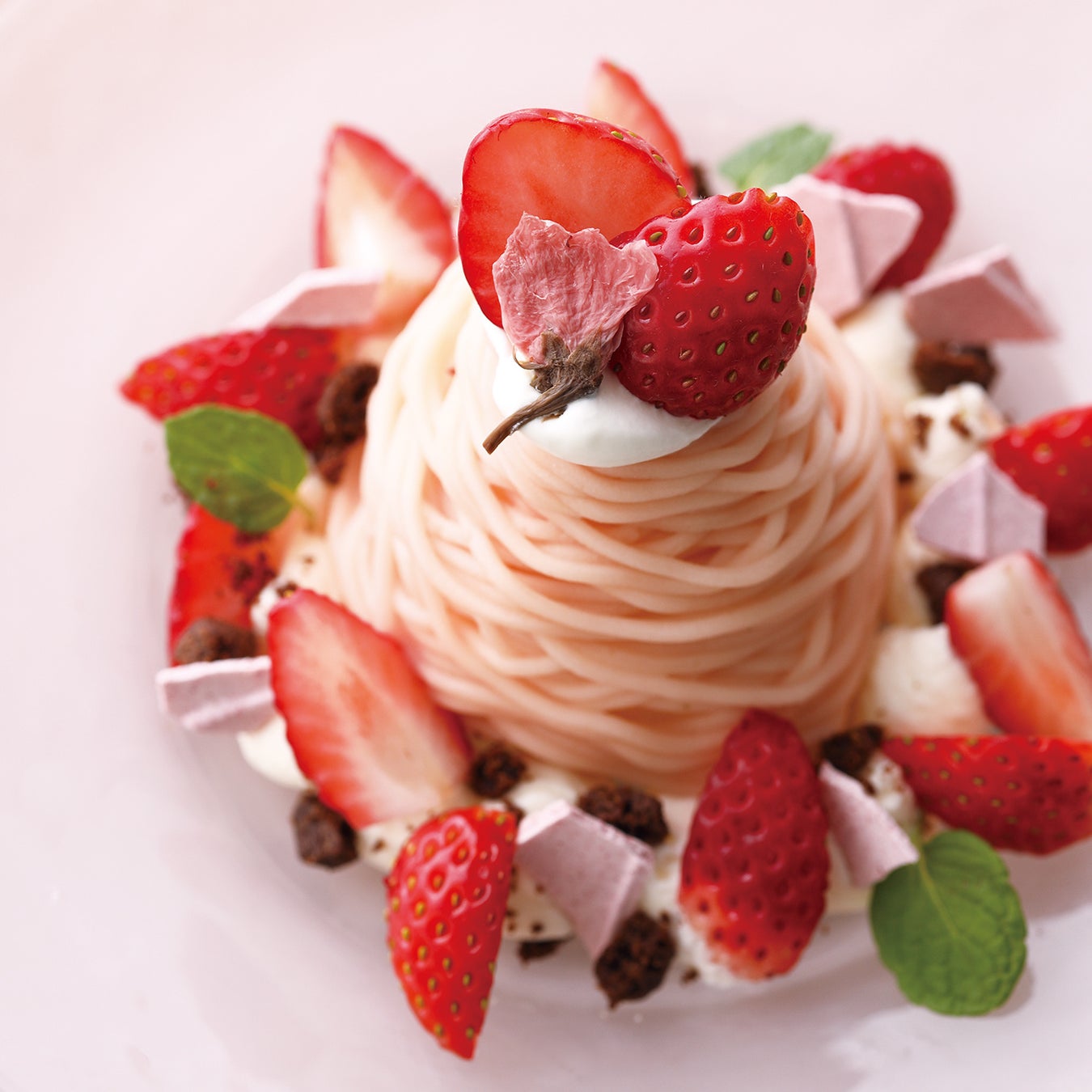 フレッシュ苺とマスカルポーネクリームに桜あんクリームを絞った春のモンブラン。カカオクランブルとメレンゲとご一緒にお召し上がりください。