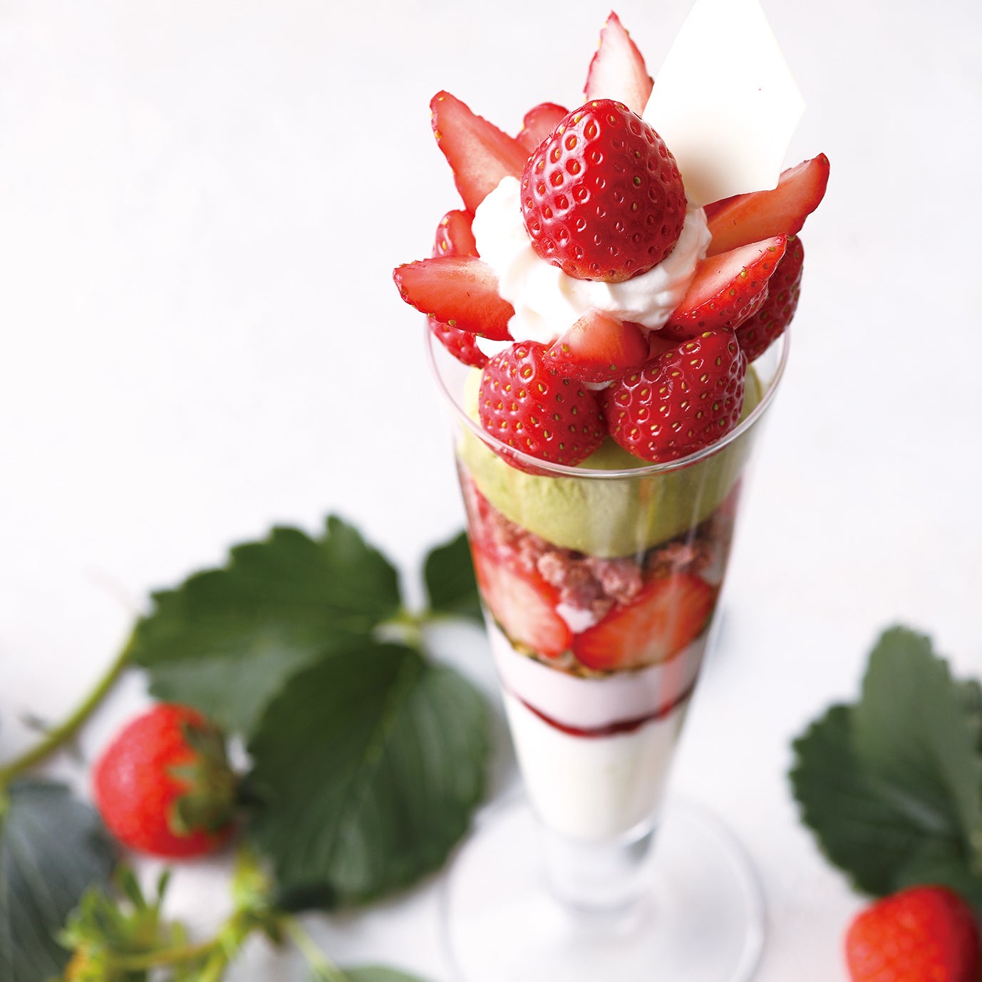 一番のおすすめ「苺とピスタチオのパフェ」は、グラスにも飾りにもたっぷりの苺を使用した華やかな新作。ピスタチオアイスやフランボワーズクランチをあわせて見た目も味わいも春らしく仕上げました。