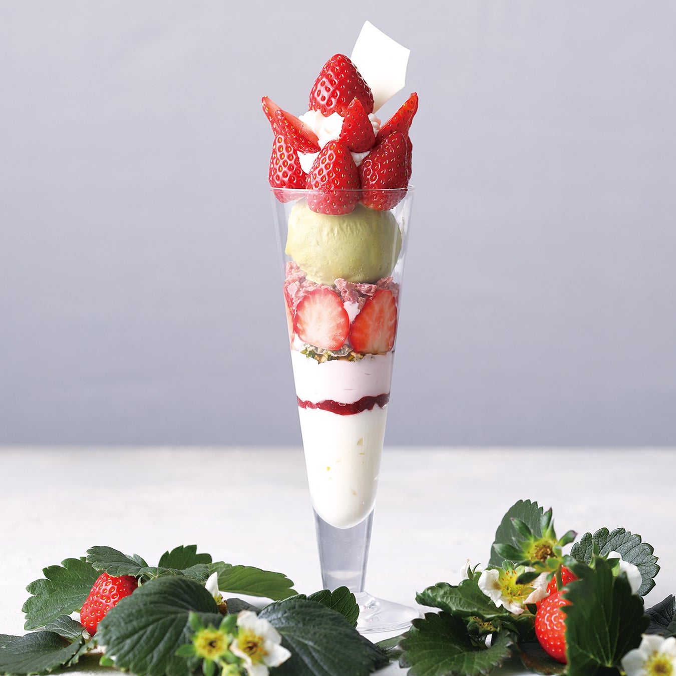 たっぷりの苺とピスタチオアイスに、甘酸っぱいフランボワーズクランチとやさしい甘さのココナッツゼリーを合わせた、春色のパフェ。