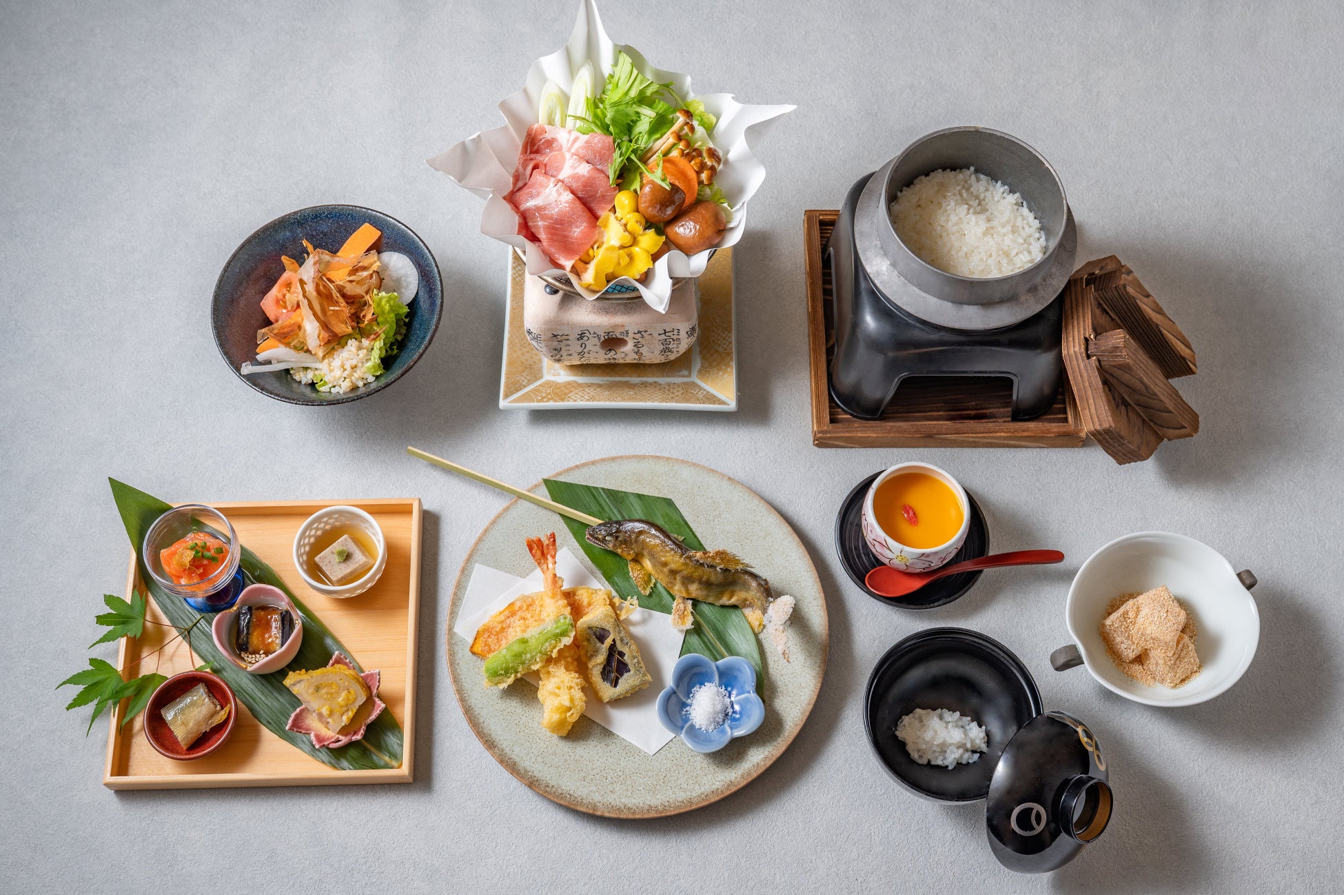岐阜県産素材にこだわり、新米を堪能するディナーコースをご用意しました。メインには、新米の団子やきのこなどを使用した岐阜県郷土料理の「すったて鍋」。新米の炊き立て羽釜ご飯は、このプラン限定で白米に加え、きのこの混ぜご飯をお選びいただけます。