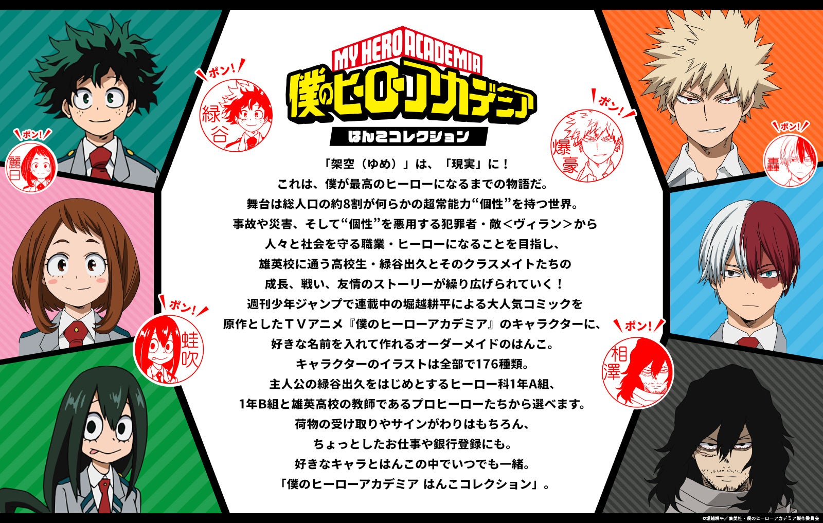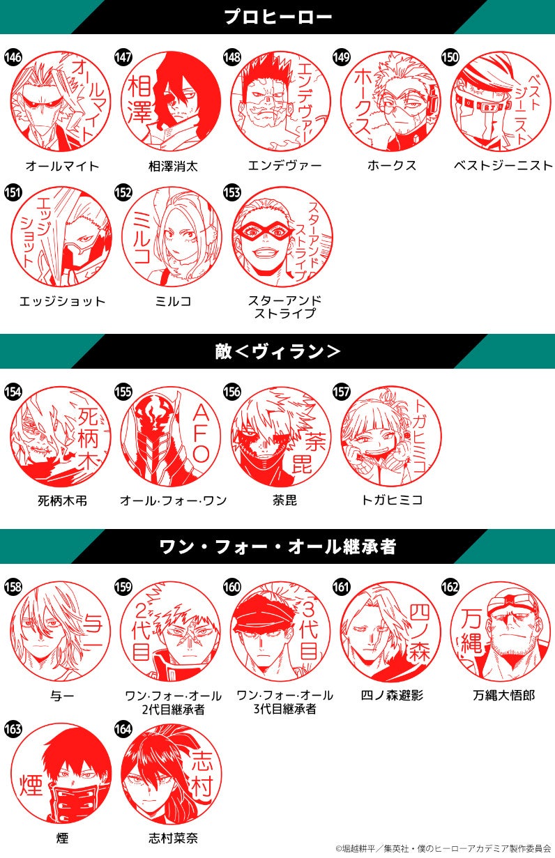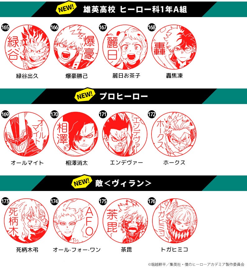 「僕のヒーローアカデミア はんこコレクション」は、TVアニメ『僕のヒーローアカデミア』のお気に入りのキャラクターと好きな名前や文字でつくれるオーダーメイドのはんこ。雄英高校1年A組、1年B組の生徒からプロヒーロー、敵<ヴィラン>など、これまでSNSから寄せられたリクエストに応えて、キャラクタービジュアルを164種類まで増やしてまいりました。