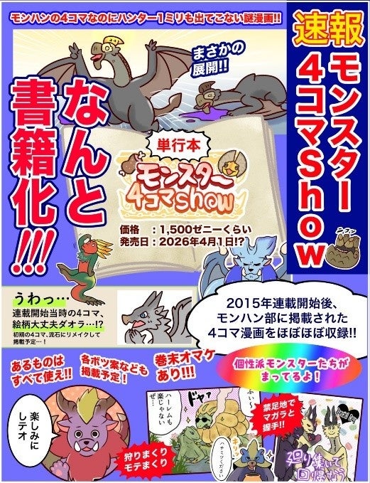 2025年6月11日(水)、カプコンの人気ハンティングアクションゲーム『モンスターハンター』シリーズのモンスターたちが登場する4コマ漫画『モンスターハンター モンスター4コマShow』が双葉社から発売されます。