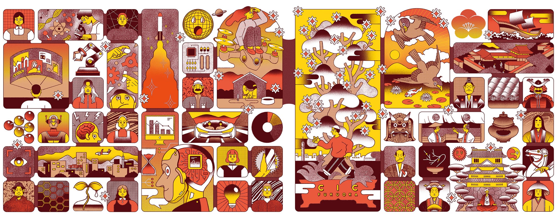 アメリカ発のイノベーションキャンパス「CIC Fukuoka」のエントランスには福岡の伝統工芸品「大川組子」を採用(※1)。繊細でデザイン性の高い障子や欄間などを製作する組子職人・志岐 浩実(七代目利右衛門) 氏のアート作品が出迎えます。また、区画内の4壁面にそれぞれ異なる4人のアーティストによる、ウォールアートプロジェクト(※2)も実施されます。