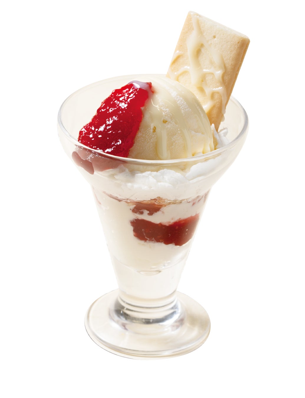 『クレーム・アンジュ』にホイップクリーム、ざくざく食感のフルーツグラノーラ、果肉感のあるストロベリーソース、バニラアイスを盛り込みました。様々な素材と甘み、酸味などが相まった美味しさを楽しむことができるパフェです。クックダッセホワイトチョコを添えて、ラズベリーソースをトッピングし、コンデンスミルクをかけて仕上げました。