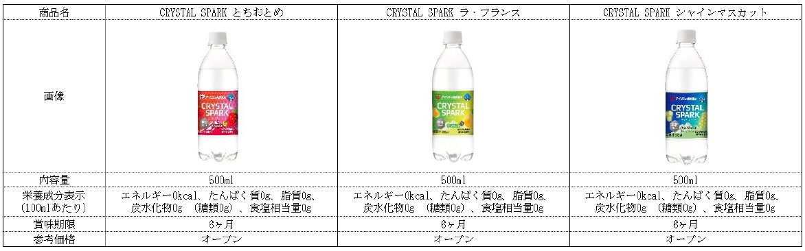 「CRYSTAL SPARK とちおとめ」は、ジューシーな甘みとしっかりとした酸味を楽しめます。「CRYSTAL SPARK ラ・フランス」は、瑞々しい香りと上品な甘み、やさしい酸味が感じられるフレーバーです。「CRYSTAL SPARK シャインマスカット」は、フレッシュな果皮の香りとすっきりとした甘みを楽しめます。(無果汁)