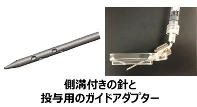 iPS細胞は健康な方から作られたものを用います。iPS細胞を非常に純度の高い心筋細胞に分化させこれを特殊な培養方法を用いて球状の塊にし、より心臓に生着しやすいように工夫しています(図左)。心臓に投与する際に用いる針もこの治療用に開発されたものであり、心臓をなるべく傷つけないよう、深く入りすぎないような工夫が施されています(図右)