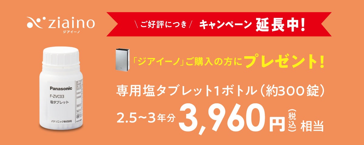 2022年11月1日より実施している専用塩タブレットプレゼントキャンペーンの期間延長が決定しました。対象の次亜塩素酸 空間除菌脱臭機「ジアイーノ」をご購入の上、ご応募いただいた方全員に、専用塩タブレットをプレゼントするキャンペーンを2023年3月31日(金)(※購入期間)まで延長します。