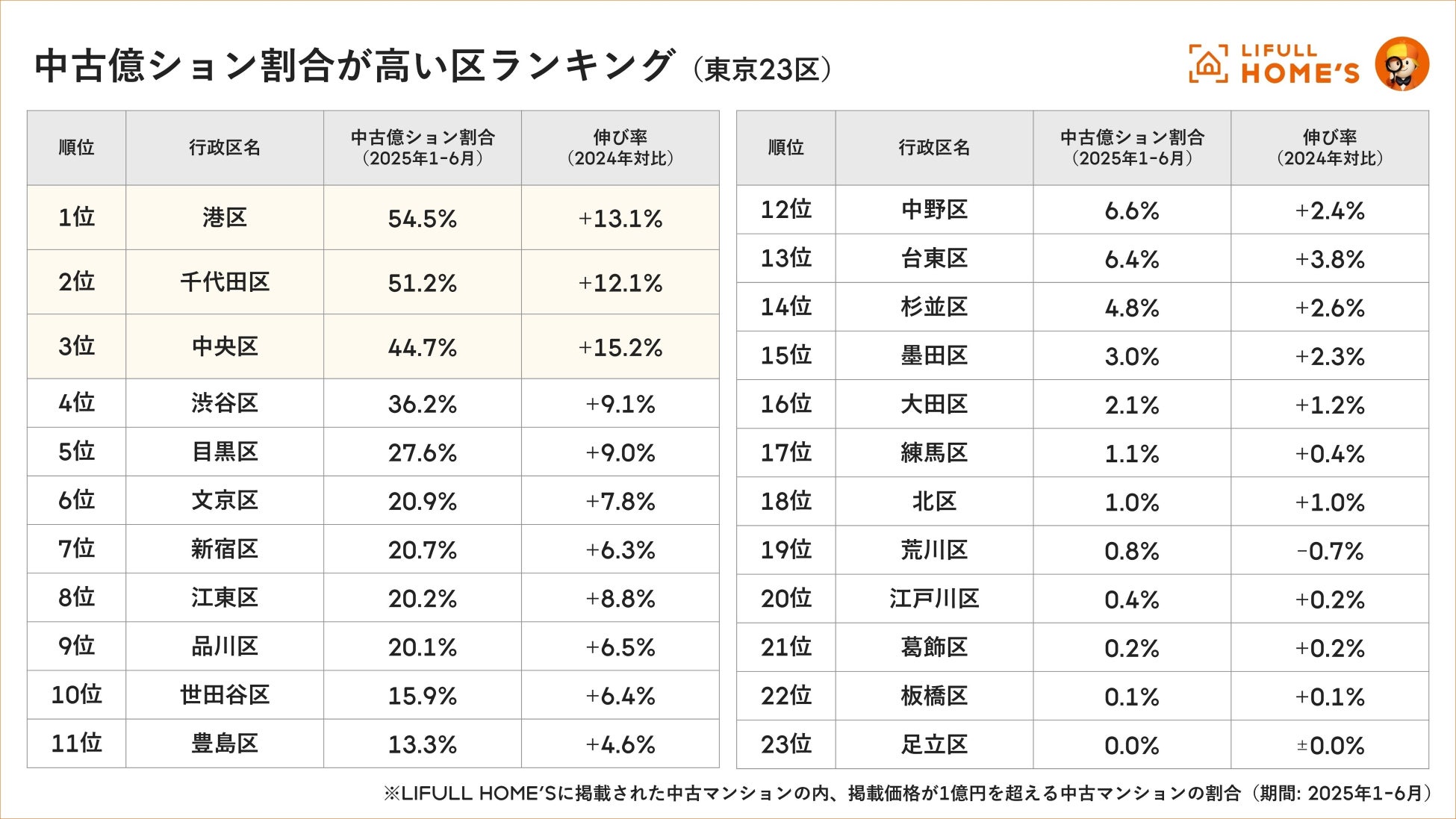 2025年(1-6月)の中古億ション割合を区ごとに集計した「中古億ション割合の高い区ランキング」を作成しました。その結果、1位「港区(54.5%)」、2位「千代田区(51.2%)」、3位「中央区(44.7%)」となり、TOP3は中古マンションのほぼ半数が億ションという結果になりました。