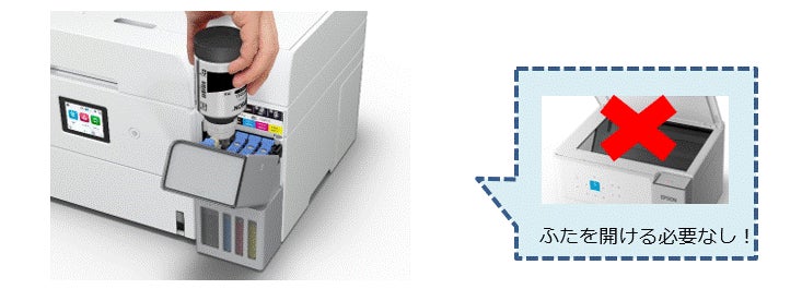 前面のインクタンク部分が独立しているので、スキャナーのふたを上げることなく前面操作で簡単にインク補充ができます。