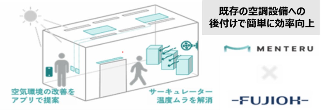 IoT技術とAI技術を用いて、建物のエネルギー効率を最適化するサービスを提供する株式会社メンテルと、業務用換気扇やレンジフードを製造している富士工業株式会社が連携。神奈川県の支援を令和6年度に受け、空調設備の入替などの大規模な改修を行うことなく店舗の空気環境を改善できるシステムを開発しました。 このシステムではAIによる気流解析を行い、既存のエアコンと後付けサーキュレーターを制御。風量や風向き、温度設定等をコントロールすることで、室内の温度ムラを削減し、CO2排出量と光熱費の大幅な削減を目指しています。 |