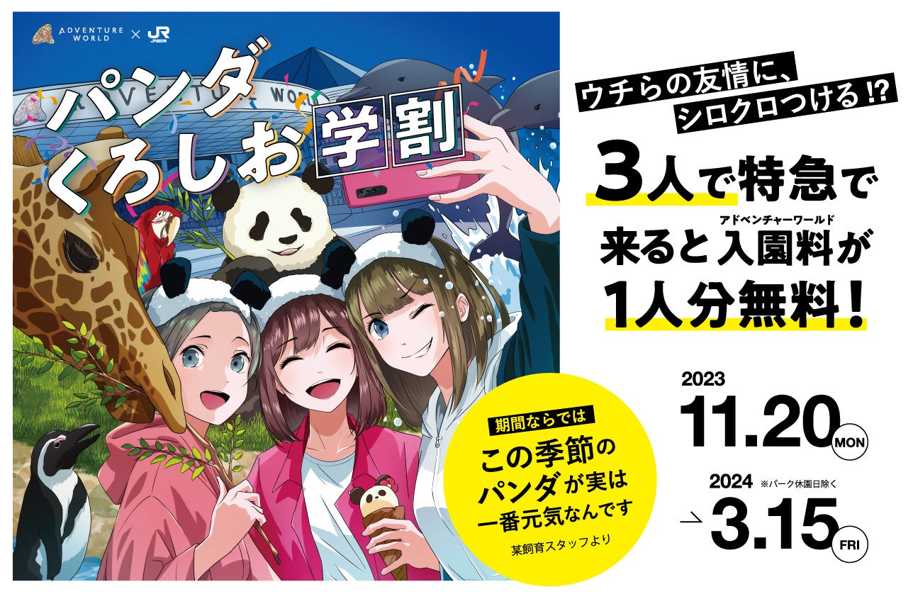 特急くろしお号を往復3名で購入した場合、アドベンチャーワールド入園券1名分が無料になる学生限定キャンペーン