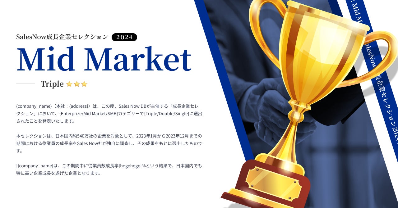 「誰もが活躍できる仕組みをつくる。」をミッションに掲げ、セールスチームの武器となるデータベース「SalesNow」を展開する株式会社SalesNow(本社:東京都渋谷区、代表取締役:村岡功規、以下「SalesNow」)は、国内540万社を完全網羅している「SalesNow DB」に蓄積されている従業員データから従業員成長率の高い企業を選出し、3つのカテゴリー別に「SalesNow成長企業セレクション2024」を公開しました。