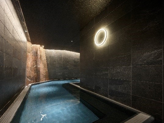 地下1階には洞窟のような空間が特長の大浴場をご用意。重厚感のある石積みと、そこから荒々しく露出した地下の岩肌をイメージした壁、モダンなモザイクタイルと丸みを帯びた形状が印象的な浴槽、水面(みなも)を表現する光の演出により、日常とは異なる上質なSPA体験を提供します。洗い場はシャワーブースを中心とし、使い勝手の良い規格としています。