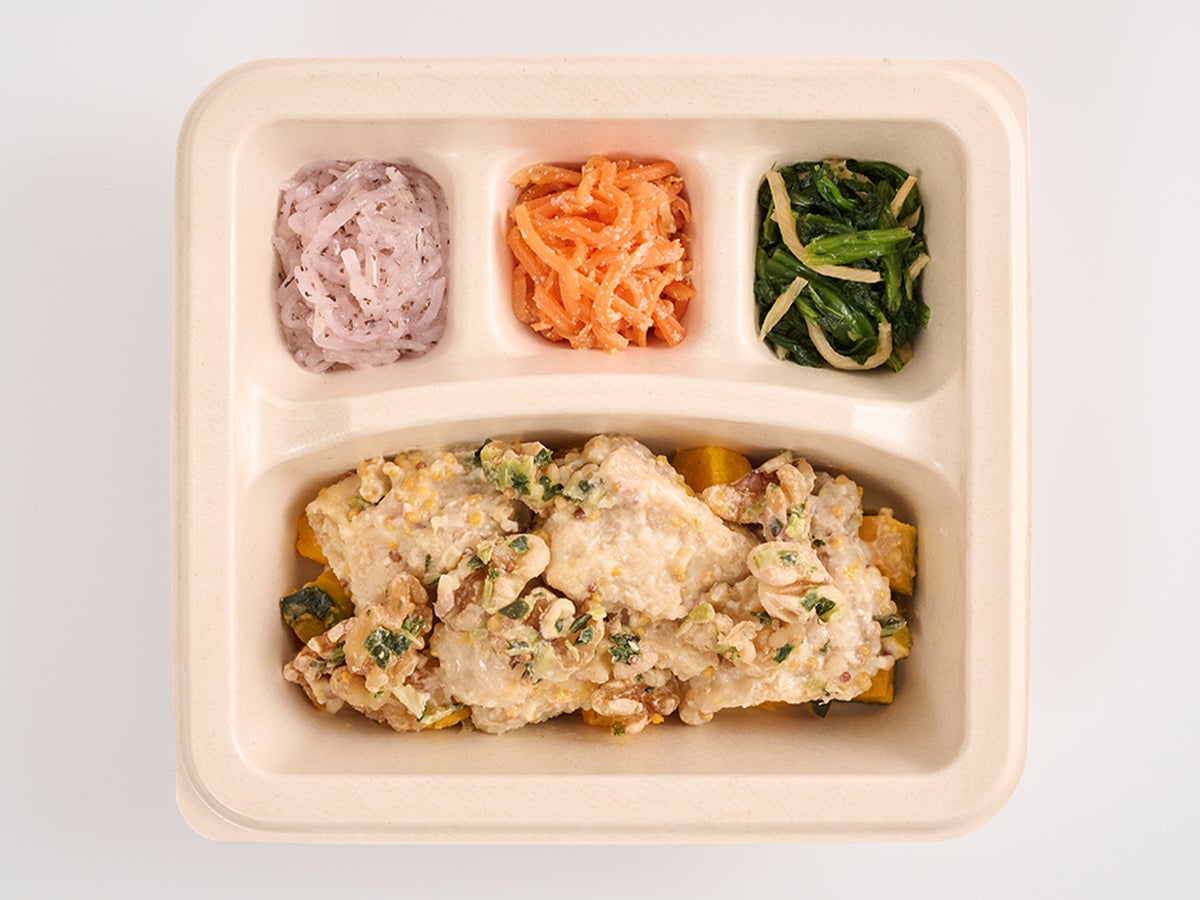 副菜は、赤しそで彩りよく仕上げた大根の甘酢和え、メインのから揚げと一緒に食べても美味しい人参のごま和え、シャキシャキのたけのこ入りのほうれん草のオイスター仕立てです。