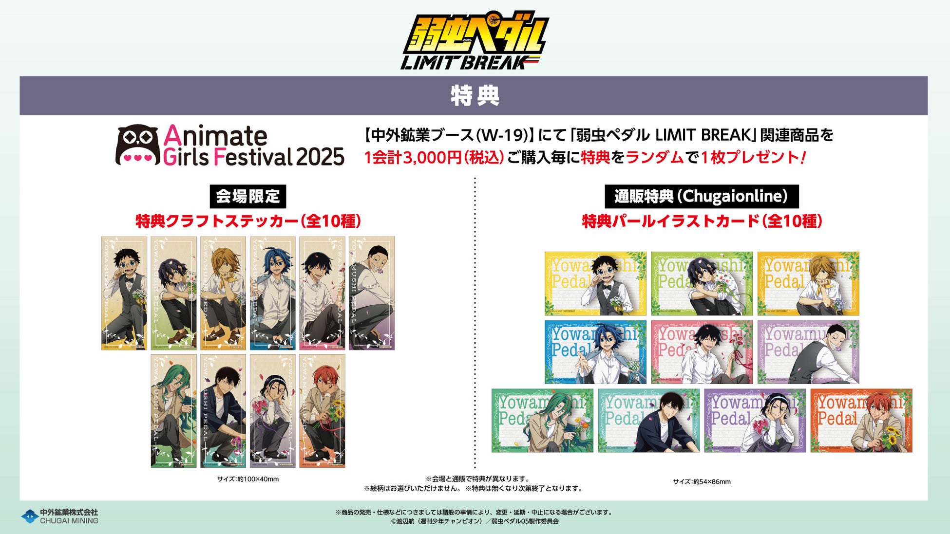 中外鉱業コンテンツ部ECサイトにて『弱虫ペダル LIMIT BREAK』AGF関連商品を1会計3,000円(税込)ご購入毎に、特典パールイラストカード(全10種)をランダムで1枚お渡しいたします!