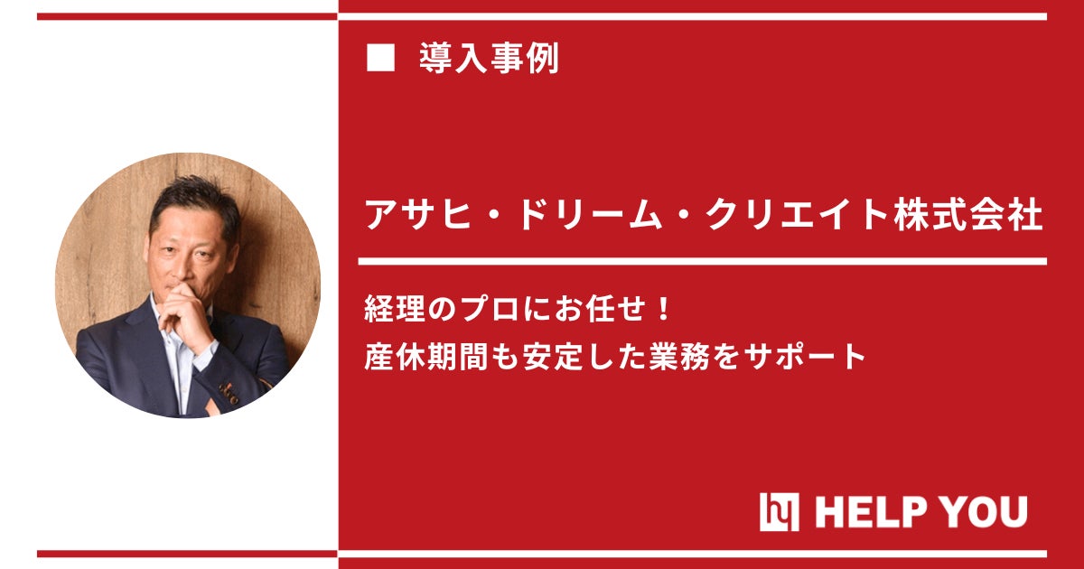 このたび、アサヒ・ドリーム・クリエイト株式会社(本社:大阪府枚方市、代表取締役:橋本 英雄氏)へ「HELP YOU 経理プレミアム」サービスを提供し、産休に入る経理担当者の業務の継続性を確保しながら、スムーズな運営を実現しました。「HELP YOU経理プレミアム」の中でも1名の実務アシスタントが担当する「1名専属体制」を導入いただいている同社に、依頼背景や感想などを伺いました。