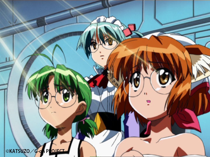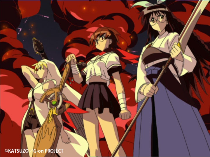 『G-onらいだーす』は、2002年7月~10月にかけて放送された平田雄三&木村真一郎の人気タッグが贈るオリジナルアニメ作品です。“SFメガネちっく美少女剣劇アニメ”と題し、倉間ユウキ、嵐山セーラ、星川ヤヨイの少女3人が、メガネ型の武器“G-on”(ジオン)を手に、地球侵略を狙う宇宙人と戦う物語を描いた本作。登場する女の子すべてが“メガネっ娘”という大胆な設定が大きな話題を呼び、「月刊コミック電撃大王」にて漫画連載化を果たすなど人気を博しました。