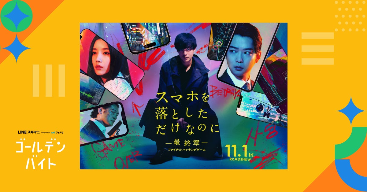 LINEヤフー株式会社(以下LINEヤフー)は、企業とユーザーの”スキマ時間”をマッチングする単発雇用サービス「LINEスキマニ」において、スポットワークを通じて普段できないような特別な体験ができる「ゴールデンバイト」を開始します。本日より、「ゴールデンバイト」第一弾として、大ヒット映画シリーズ最新作『スマホを落としただけなのに ~最終章~ ファイナル ハッキング ゲーム』の完成披露試写会の求人募集を開始します。