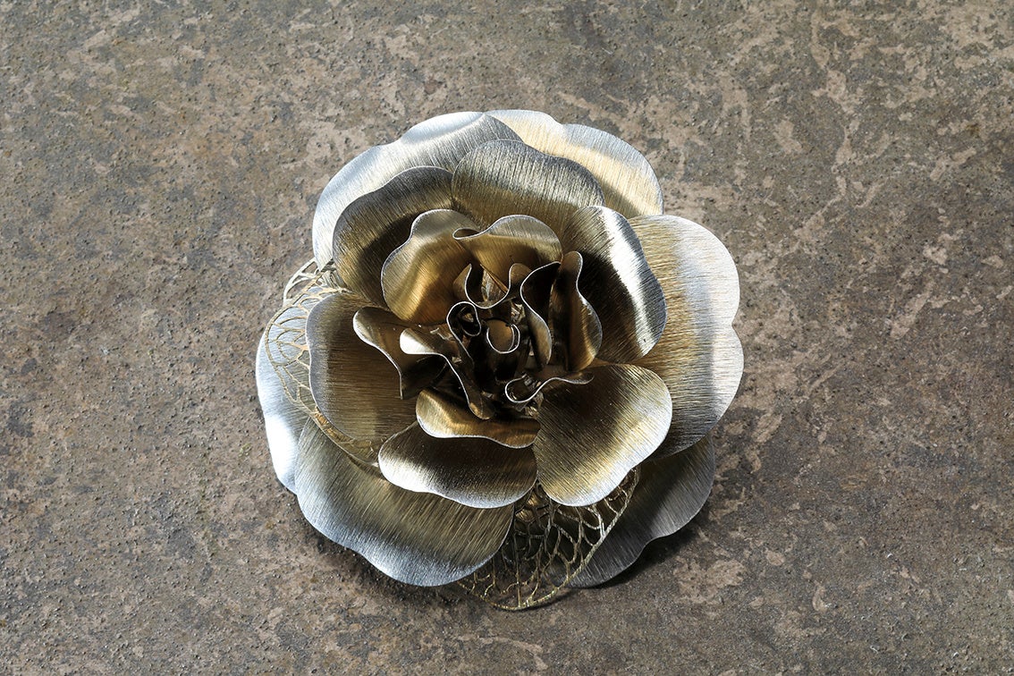 アクセサリーやジュエリーに使用される金・銀・銅は比較的柔らかいため加工し易い材質ですが、THE BLOSSOの素材であるステンレスは金属の中でも非常に硬いため、加工が難しく、穴を開けるにも大きなマシンが必要です。この硬いステンレスを用いて花々の優しさを表現するためには、時間をかけて慎重に成型する必要があります。薄く硬いステンレスを繊細な手仕事により、和紙やシルクと見まがう柔らかな表情に仕立て、花特有の曲線美を鮮やかに再現します。