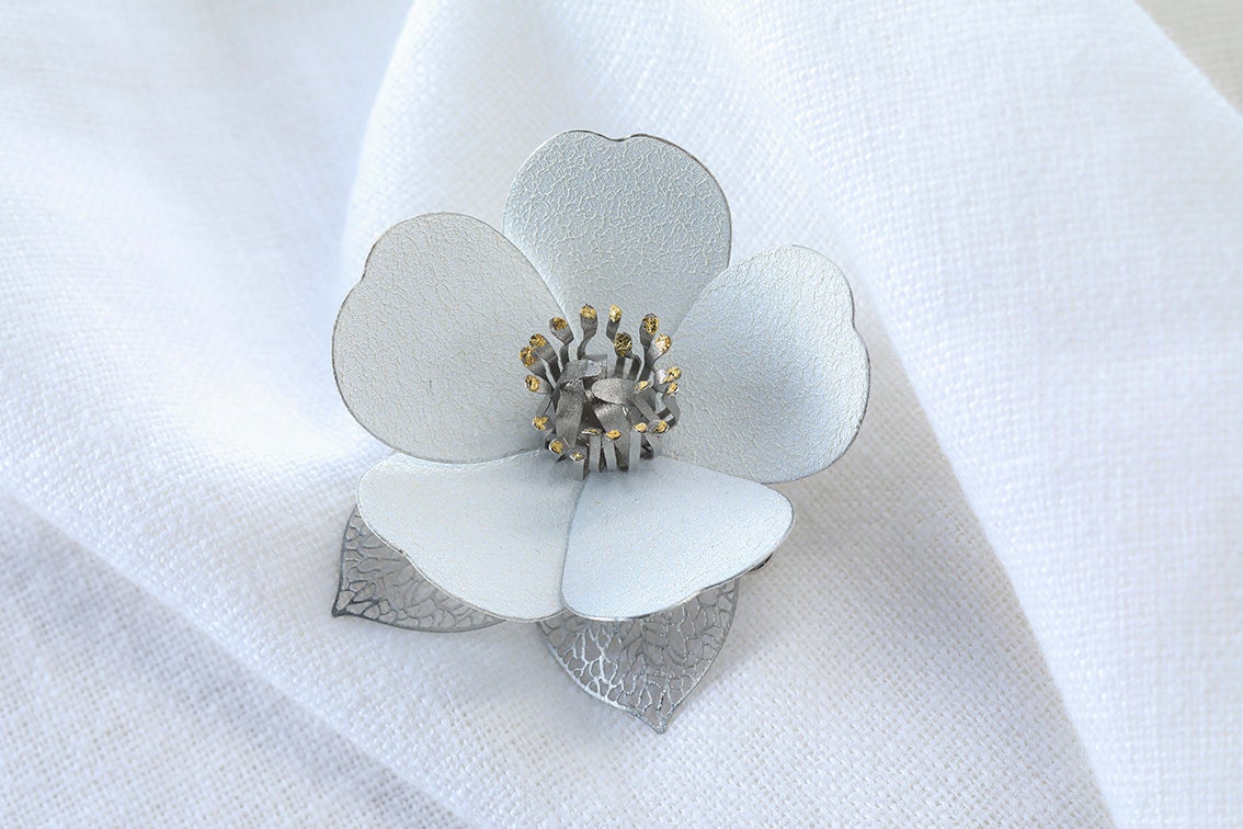 御神木から白玉稲荷神社に続く「椿 花小路」に咲く、1枚の花弁が紅白に染まる八重咲きの椿「玉有明」。赤と白のグラデーションがもたらす華やかでめでたい様を、ゴールドからシルバーへのグラデーションで気品高く、洗練されたデザインに仕立てました。金属で作られたと思えないような柔らかく優しい自然な花びらになるよう、型を作らず、手と感覚で一枚一枚仕上げています。八重咲きの迫力とボリューム感を上品に纏っていただけます。