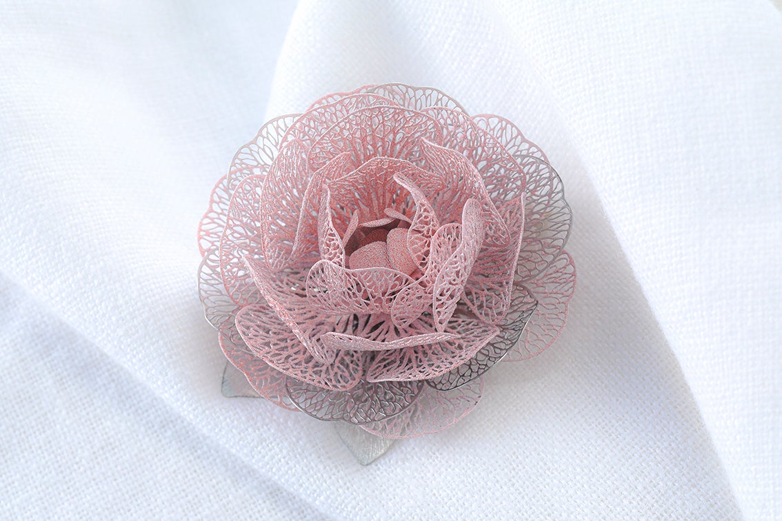 医療手術用ロボットなどの精密な部品も製作している職人たちのきめ細やかな気配りと技術により一つひとつ丁寧に生み出されるTHE BLOSSOの花は、あなたの胸でいつまでも咲き続けます。