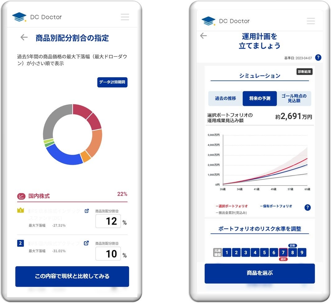 お客さまのリスク許容度や運用期間を基にしたポートフォリオ提案から掛金の配分設定や保有資産のリバランスの際の運用商品選びのサポート、将来予測の比較など、長期にわたるiDeCoでの資産形成を全面的にバックアップする多様な機能を搭載しています。