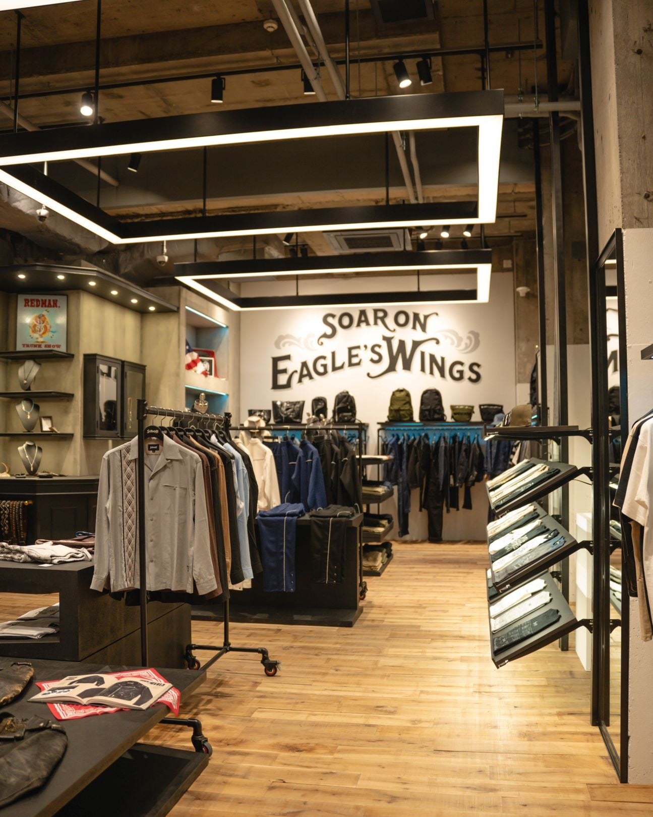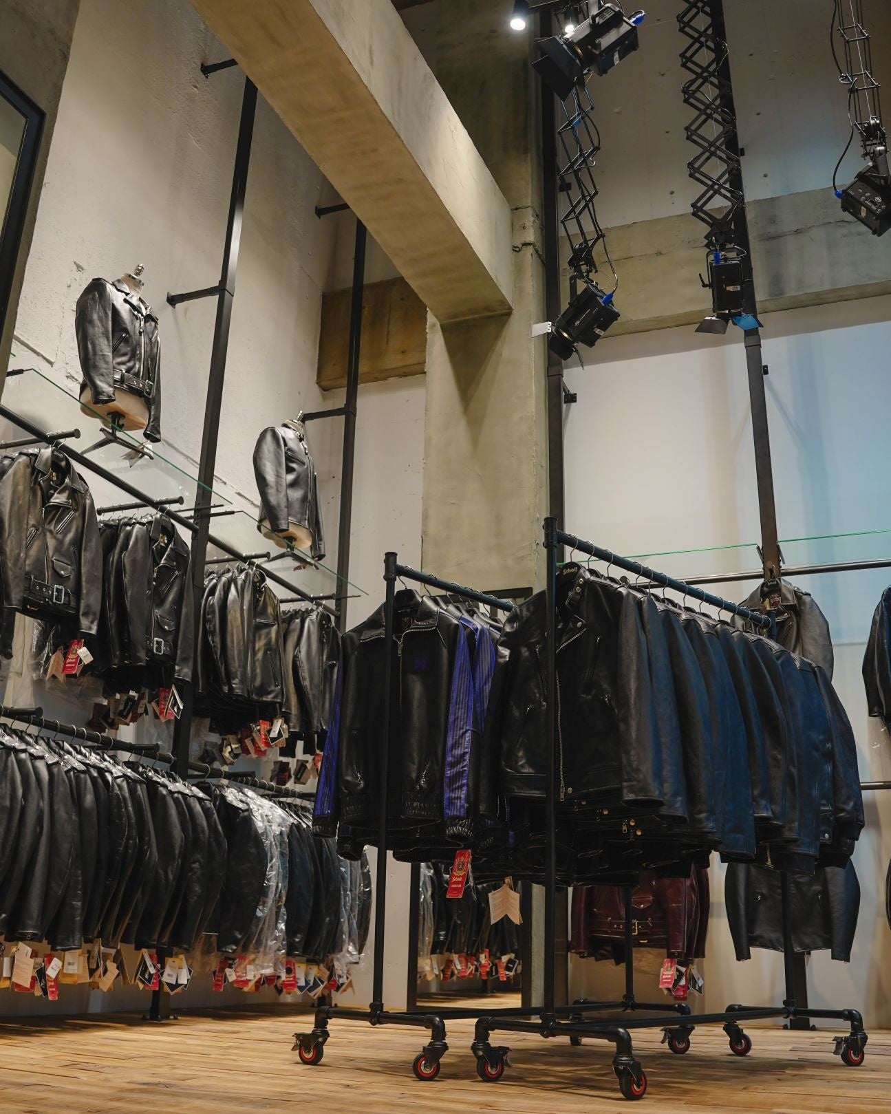 2階の「Schott」は、上がる階段からすでにムードを作られており、ニューヨークを意識したシンプルな内装ながら、7mある天高が、広くクリーンな雰囲気を醸し出し、Made in U.S.Aのレザージャケットが一堂に会して、心地よく滞在できる穏やかな空間を演出しています。
