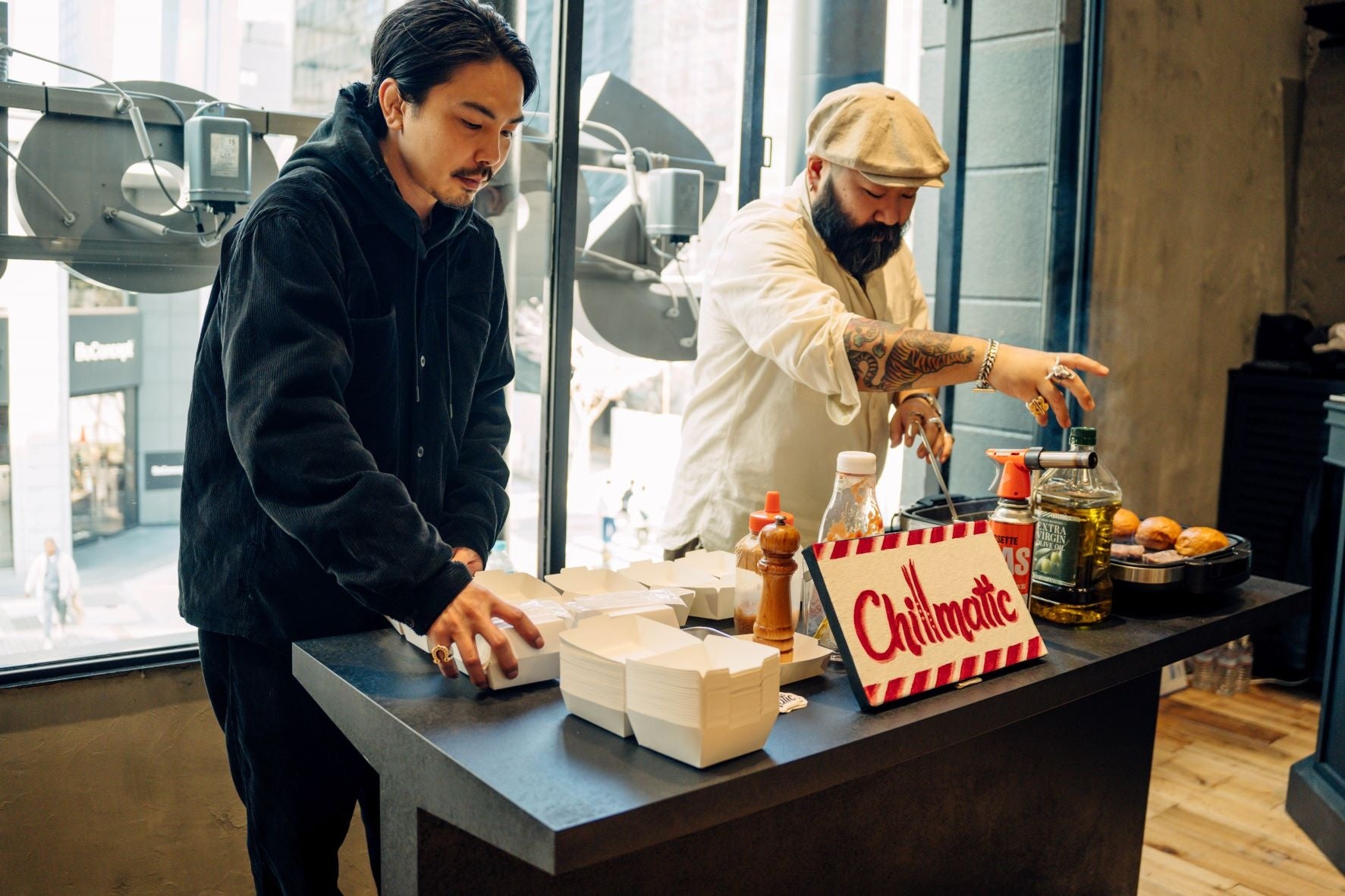 2階の「Schott」では、東京渋谷から人気のハンバーガービストロ【Chillmatic】がこの日のために駆けつけてくれ、ご来店いただいたお客様に肉本来の味わいが感じられるスペシャルミニバーガーを提供いたしました。
