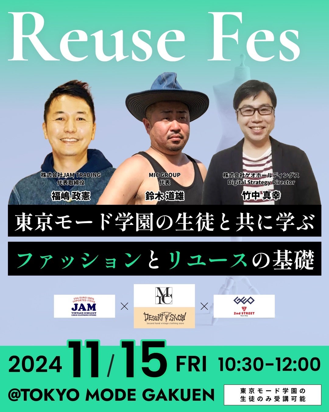東京モード学園では、株式会社ワサビが事務局を務める「リユースフェス事務局」と連携し、ファッション業界のパイオニア達による持続可能なファッションを学ぶ「リユースフェス」を開催します。