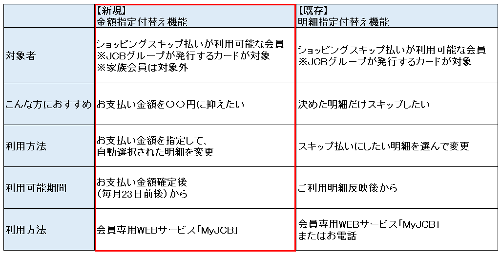 ▶「ショッピングスキップ払い」について詳しくはこちら( https://www.jcb.co.jp/service/payment/skip/index.html )