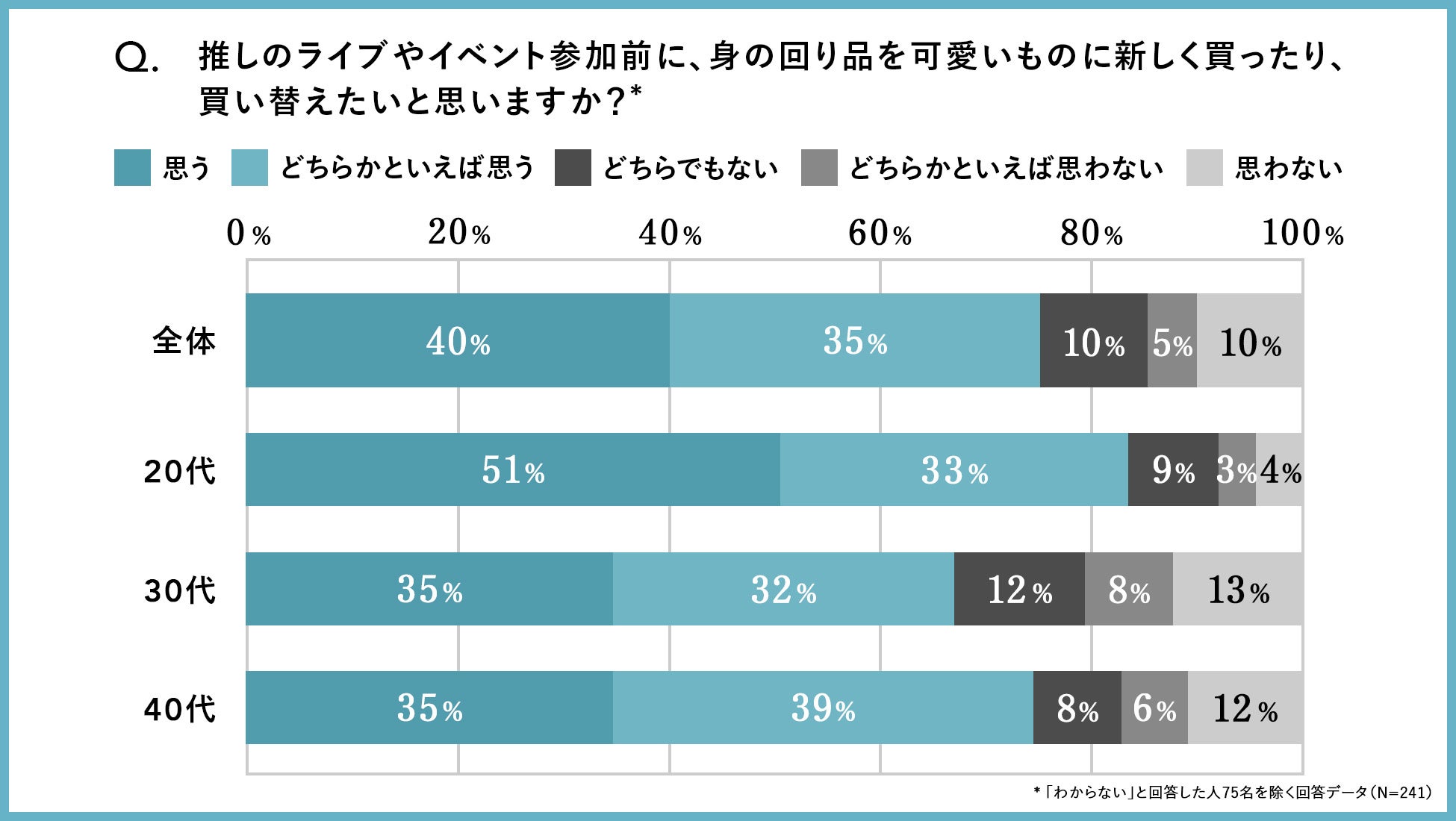 「推しのライブやイベント参加前に、身の回り品を可愛いものに新しく買ったり、買い替えたいと思いますか? 」という問いに対し、「わからない(ライブやイベントに行ったことがない)」と回答した人を除く、40%が「思う」、35%が「どちらかといえば思う」と回答し、合わせて75%の約4人に3人がライブやイベントに備えて、新アイテムを購入したい という結果になりました。