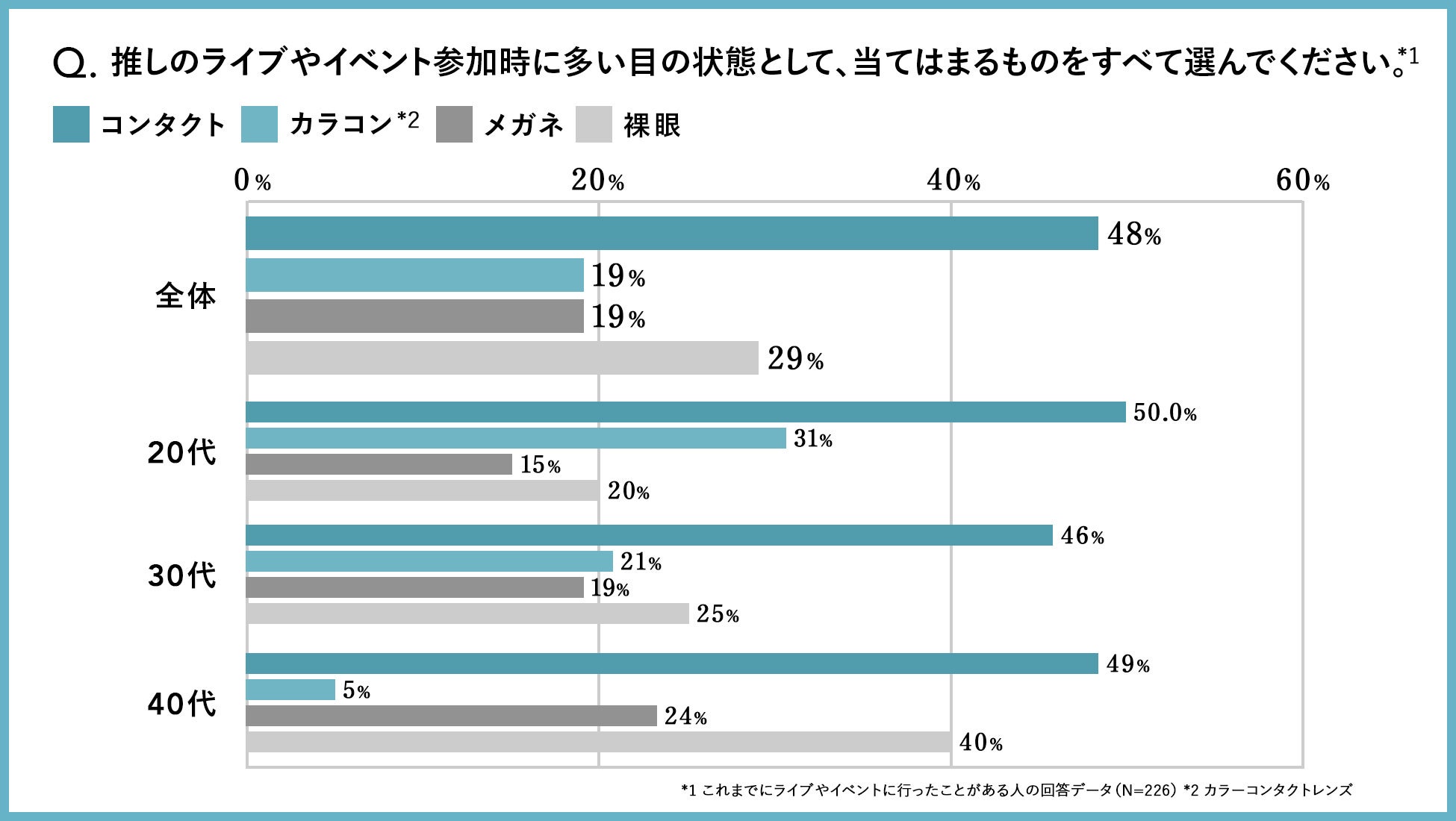「推しのライブやイベント参加時に多い目の状態として、当てはまるものをすべて選んでください。 」という問いに対し、「ライブやイベントに行ったことがない」と回答した人を除く、48%が「コンタクト(ハード・ソフト)」、19%が「カラコン*3」と回答し、合わせて67%のおよそ3人に2人がカラーコンタクトレンズを含むコンタクトレンズ着用で参加するという結果になりました。