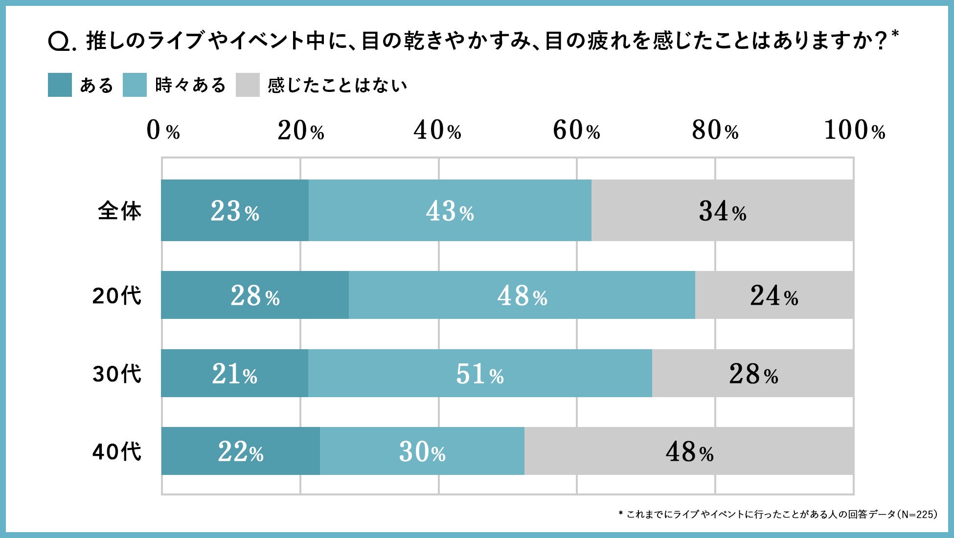 「推しのライブやイベント中に、目の乾きやかすみ、目の疲れを感じたことはありますか? 」という問いに対し、「ライブやイベントに行ったことがない」と回答した人を除く、23%が「よくある」、43%が「時々ある」と回答し、合わせて66%のおよそ3人に2人が目の乾きやかすみ、目の疲れを感じたことがあるという結果になりました。