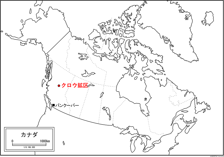 クロウ地域は、カナダ・ブリティッシュコロンビア州中央部に所在し、バンクーバーの北方700kmに位置する。対象地域は計2,736.55ヘクタールの鉱区群からなる。Pre Feasibility Studyを実施中のFPX社Decarプロジェクトと同じ地質帯に位置し、既往探査によりアワルワ鉱ニッケル鉱化が鉱区内に確認されている。