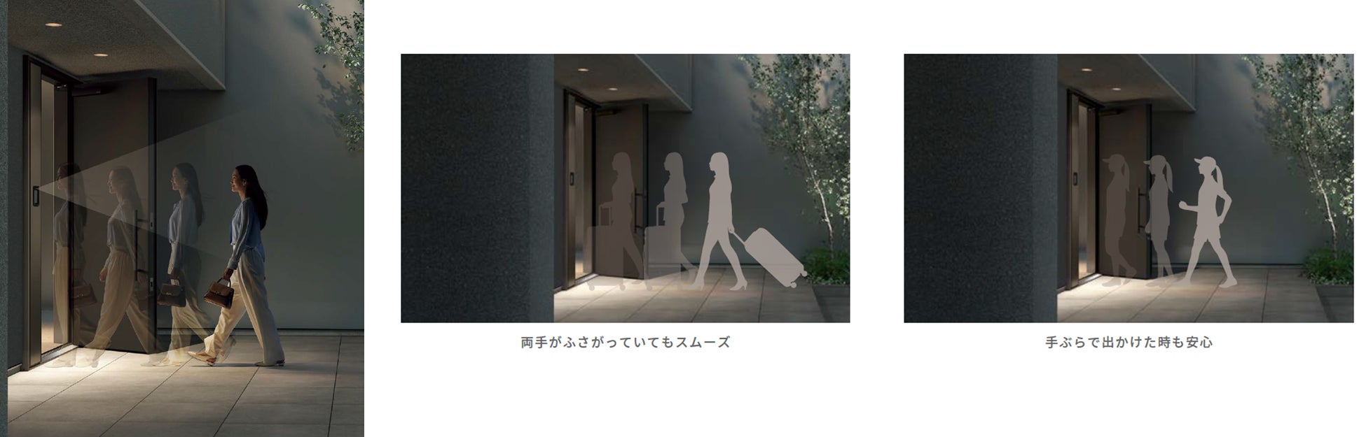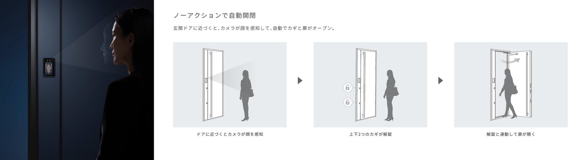 シームレスモデルに、子扉側の機能ユニットに内蔵したディスプレイ型顔認証システムを導入します。ディスプレイで自分の顔が認証できているか否かを確認ができるほか、パスワード入力での施解錠にも対応しています。自動開閉機能と組み合わせることで”玄関ドアに触れず”、”足を止めない”シームレスなエントリー体験を実現します。