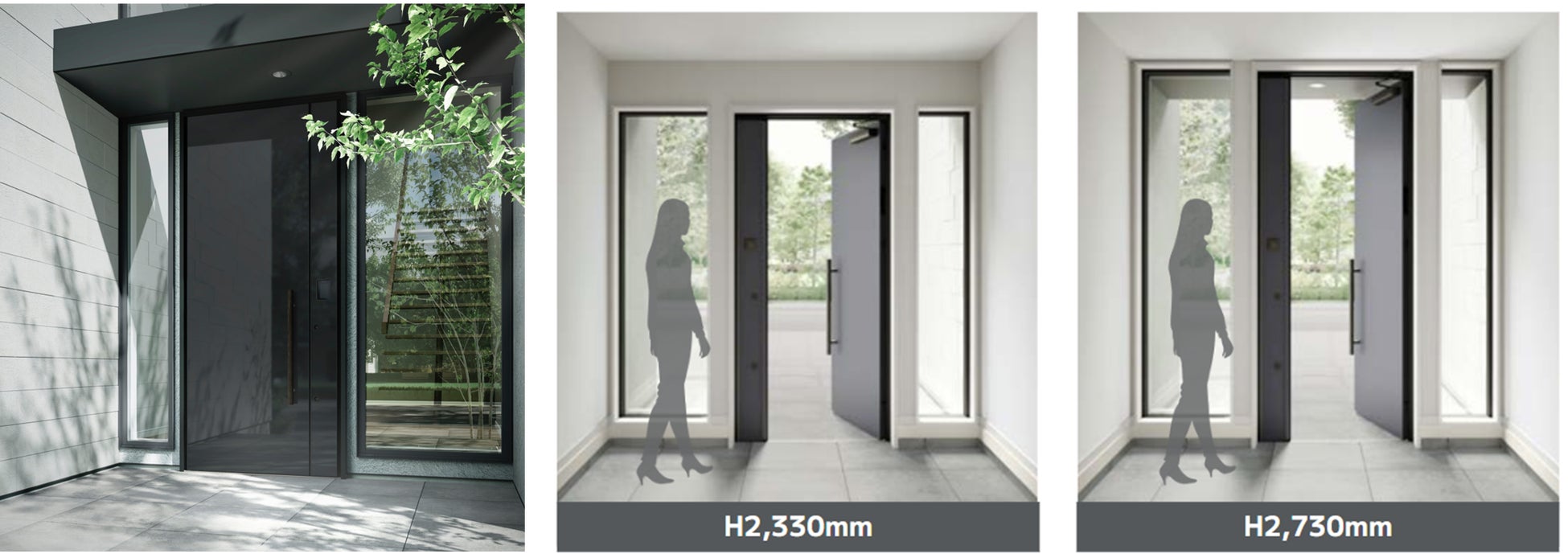 従来品では高さ2,330mmまでのラインアップでしたが、お客さまからのご要望に応え、シームレスモデルに高さ2,730mmのハイサイズを新たに追加いたします(※3)。これにより、天井近くまでドアが開くことで、一般的なドアでは味わえない開放感を実現します。