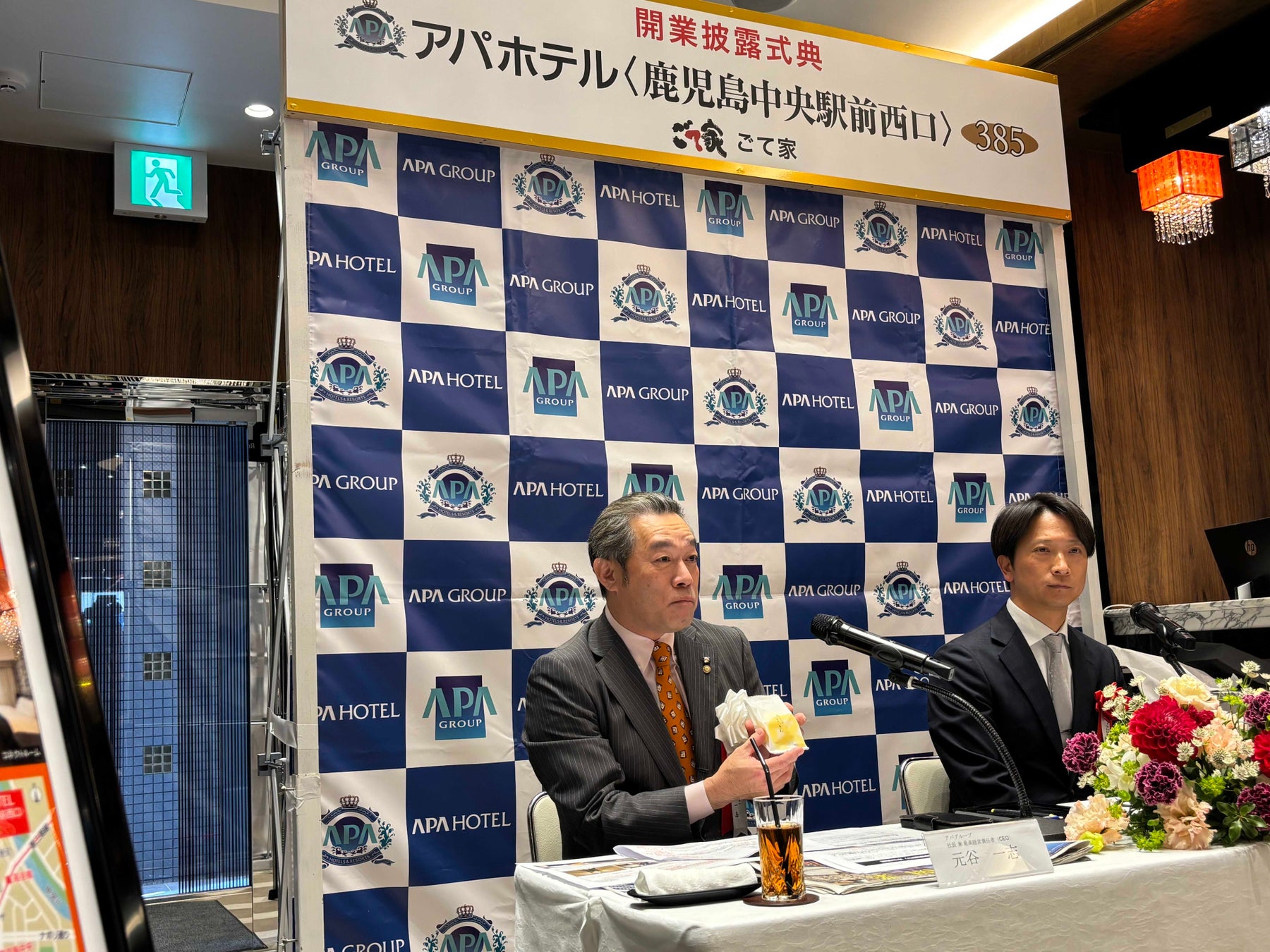 アパグループ社長兼最高経営責任者(CEO)の元谷一志は、記者発表において「鹿児島県内4棟目となるホテルを開業できたこと、また昨日12月12日に第1号店のアパホテル〈金沢片町〉が開業40周年を迎え、132室のホテルから始まり、現在のアパホテルネットワークが894ホテル・128,617室と約1,000倍の規模まで成長できたことを大変感慨深く思う。2027年3月末までに150,000室という大きな目標を掲げているので、達成できるように引き続き拡大戦略を取っていきたい。本年は約3,700万人の訪日客が見込まれており、政府は2030年までに6,000万人という目標を掲げているが、日本ほど安心と安全が確保されている国はほかにはなく、世界の観光大国と比較してもまだまだ伸びしろがあると考えている。ここ鹿児島も食事が美味しく、桜島をはじめとした観光資源も豊富であり、非常に魅力的なエリアである。地域と一緒になって鹿児島の観光を盛り上げ、地元からも愛されるホテルとして根付いていきたい。」と述べた。