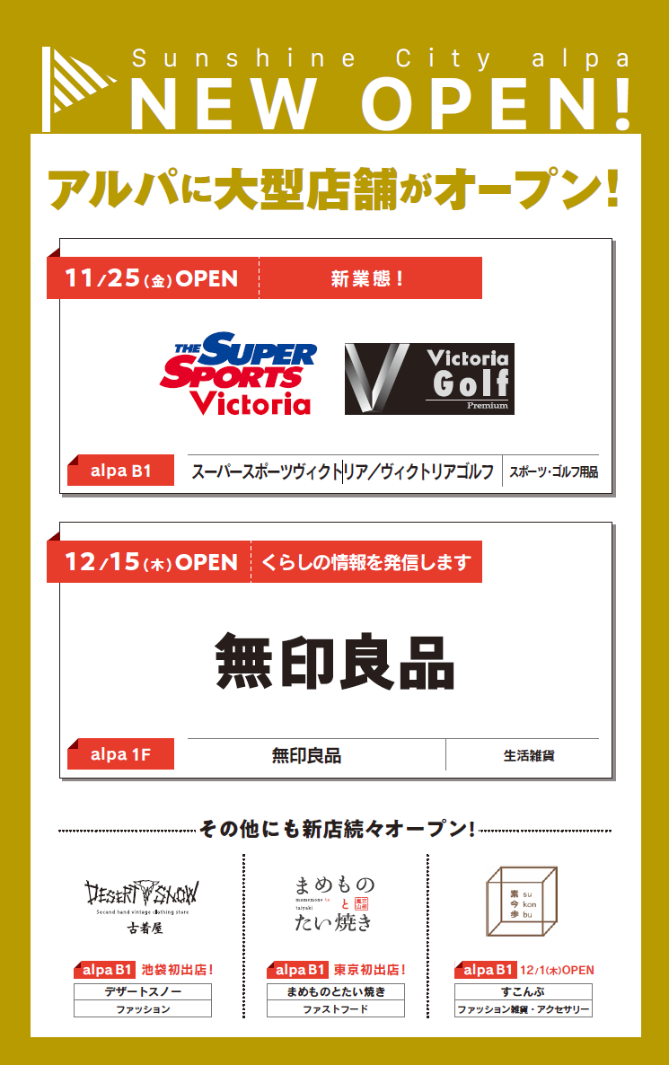 サンシャインシティ 専門店街アルパでは、大型店舗をはじめ様々なショップがオープンいたします。
