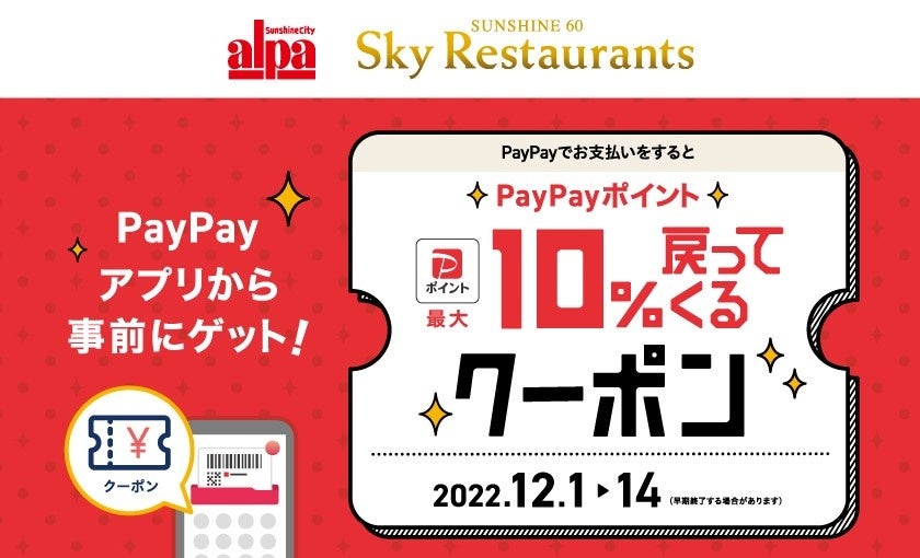 「専門店街アルパ」または「サンシャイン60 スカイレストラン」のお会計をPayPayでお支払いの際、本クーポンをご利用いただくとお支払い額の最大10%がPayPayポイントとして付与されます。