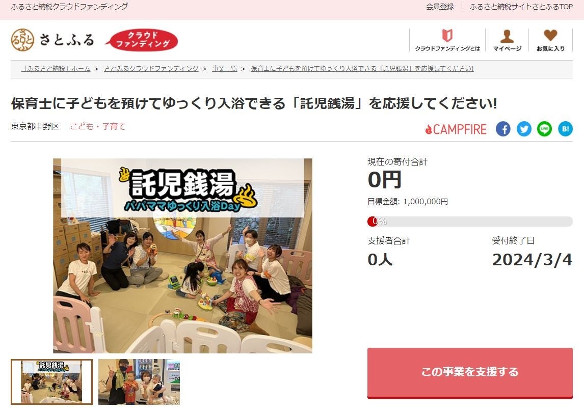 東京都中野区とさとふる、「託児銭湯」を通し保護者へ癒し時間の提供と親同士のコミュニケーション機会創出を目指し、寄付受け付けを開始