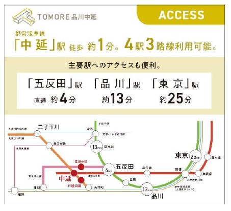 本物件は「五反田」駅や「品川」駅、「東京」駅など都心部へのアクセスが良好な都営浅草線「中延」駅 徒歩1分の地に竣工し、最寄駅含め 4駅3路線 が利用可能です。