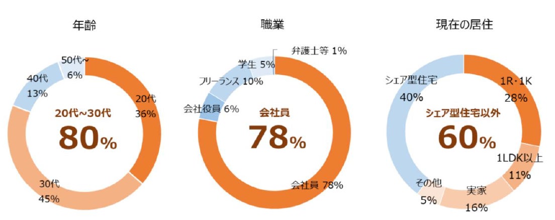 TOMORE品川中延 では現在2025年2月22日(土)の内覧会開始に向けて、「内覧会予約」を受け付けております。現在ご予約をいただいている方のうち、男女比率は概ね同等、約8割が会社員の方と幅広い方に入居を検討いただいています。また、現在の居住(お住まい)は、一般的な賃貸住宅や実家等が約6割を占め、シェア型住宅が初めての方にも高いご関心をお持ちいただいています。