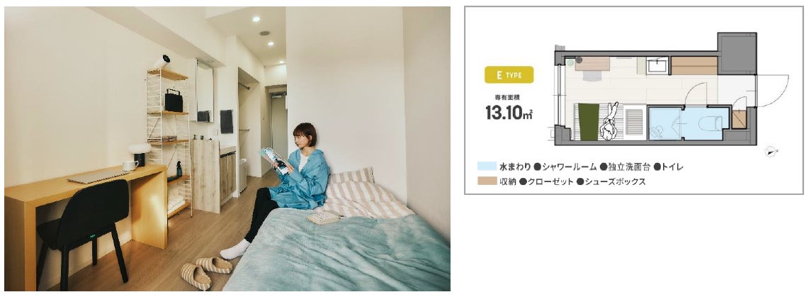 12~15㎡・全17タイプの居室内には、シャワー・トイレ・洗面台といった水回り設備やワンルーム同等の収納スペースを備える事で、「ひとり暮らしの快適性」を確保。また一部住戸にはバスタブや家具等を備え、初めてコリビング賃貸を検討いただく方にも安心してご入居いただける設備仕様となっております。