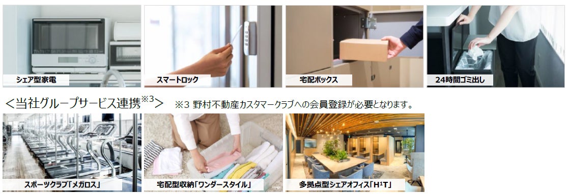 コリビングスペースの「家具やシェア型調理家電」、コワーキングスペースでの「デュアルモニター」等に加え、宅配ボックスやスマートロック、24時間ゴミ出し可能など、生活利便性の高い様々な設備・サービスを備えています。