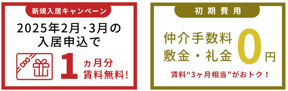さらに2025年3月末までに入居のお申込をいただいた方を対象に、「1ヵ月フリーレント(1ヵ月分の賃料無料)」 を付与する 「新規入居キャンペーン」 を開催いたします(2025年2月18日時点)。