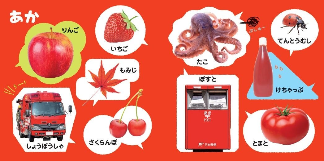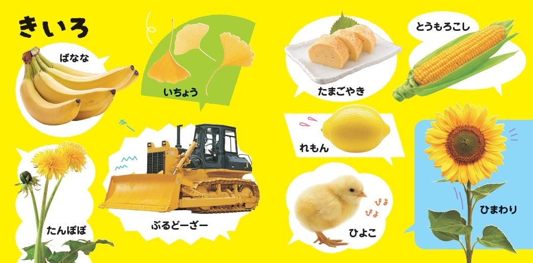 さらに、お子さまの目を引くカラフルな背景色に、吹き出しに入れて配置することで、ひとつひとつのものに自然と目が留まるように工夫されています。