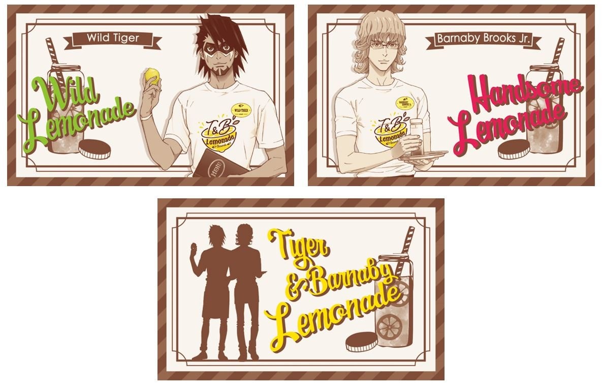 カフェオリジナルのレモネードベースのドリンク3種を販売します。注文するメニューに応じて、ヒーローのセリフやリアクションが変わります。また、購入特典として『TIGER & BUNNY』関連商品を1会計につき税込3,000円お買い上げごとに、お好きな絵柄のショップカード風カード(全3種)を1枚プレゼント!