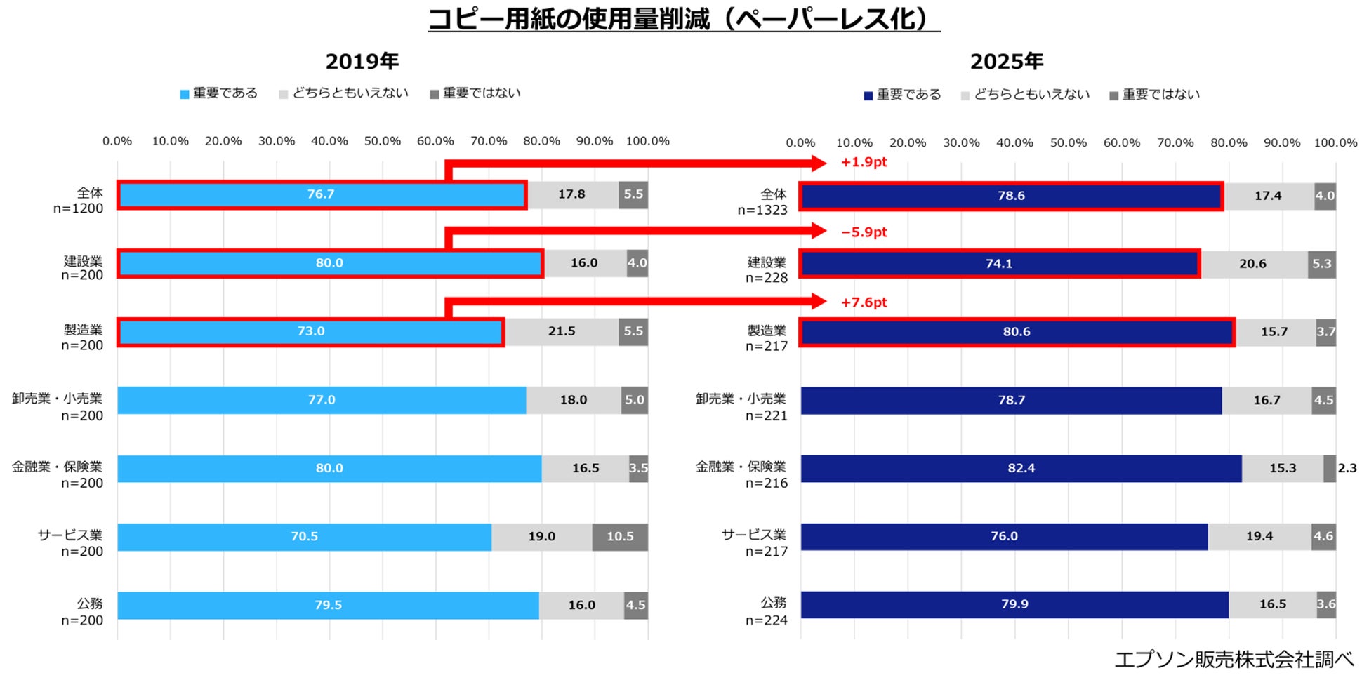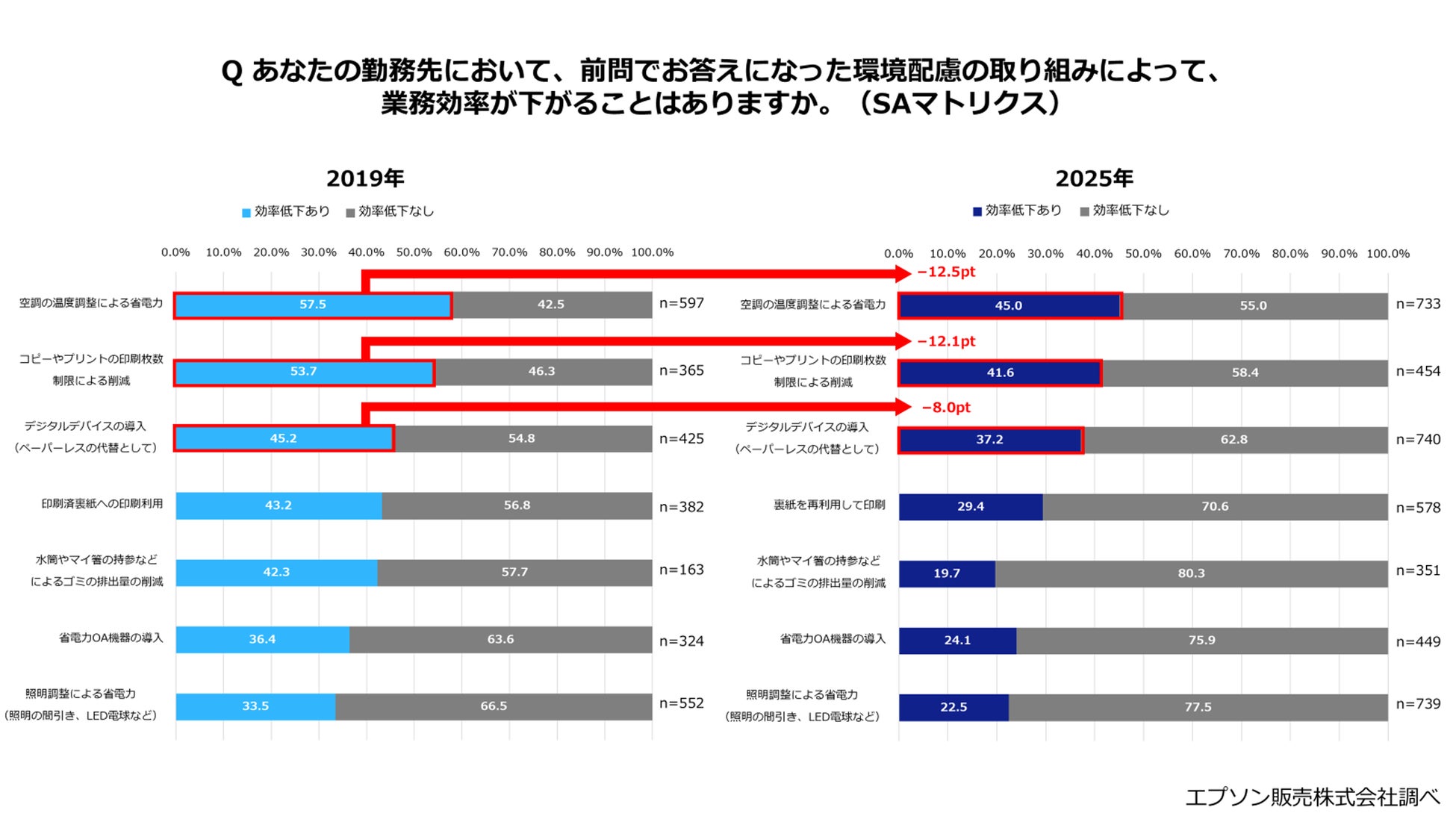 エプソン販売株式会社は、従業員数500人以上の企業に勤務する会社員(CSR・SDGs・オフィス環境改善・経営企画・オフィス機器調達などの実務・意思決定に関わる方)および公務員の計1,323名を対象に、「2025年版 ビジネスパーソンの職場における環境問題に関する意識と実態調査」を実施しました。